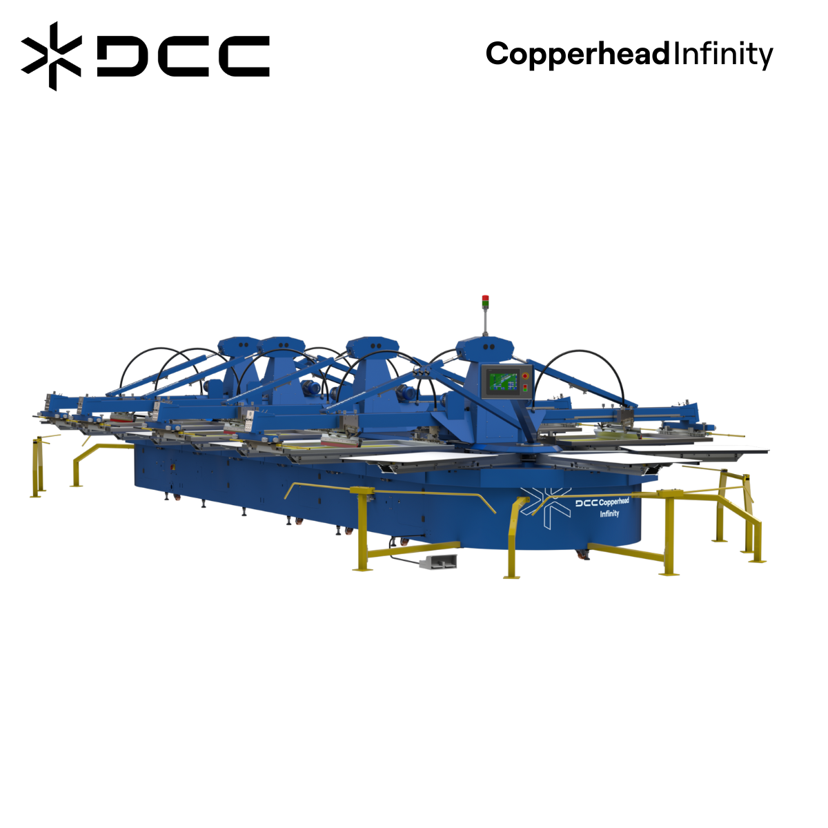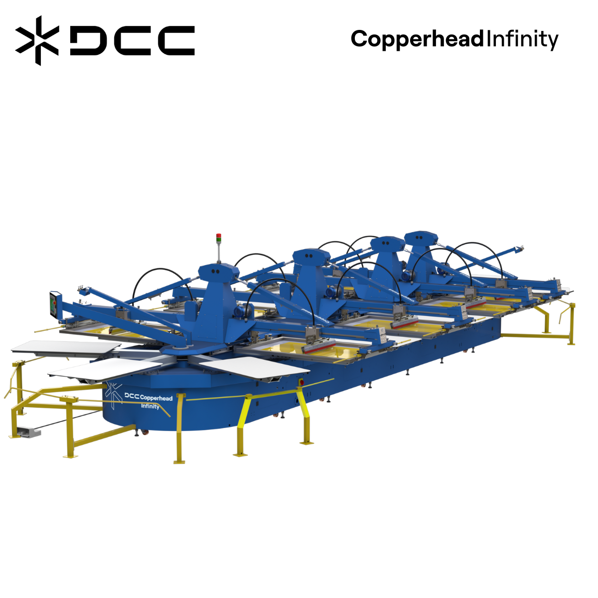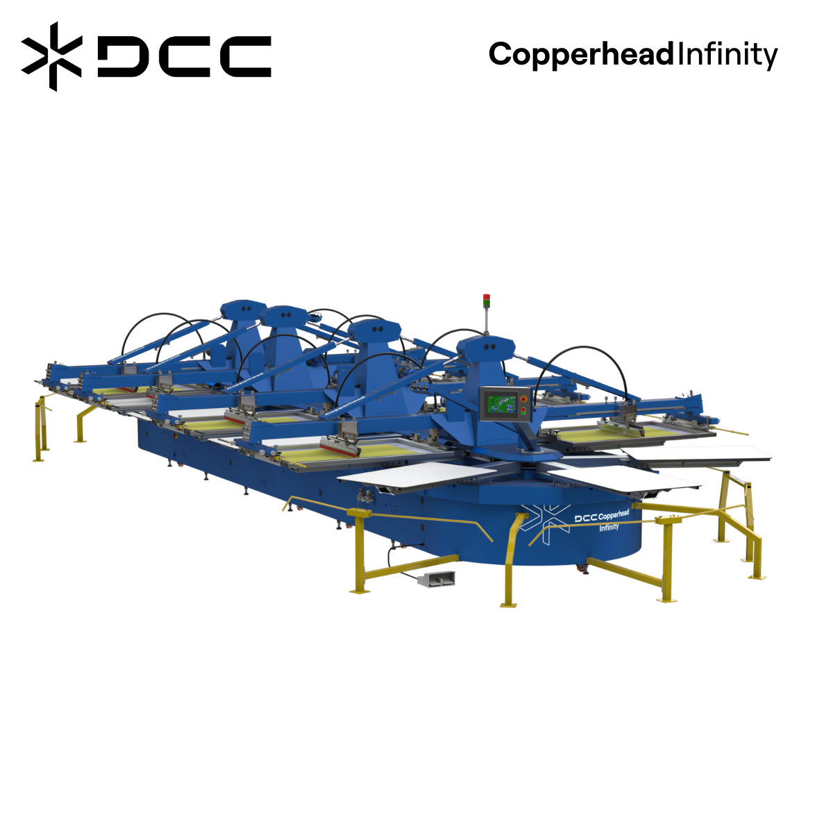 M&R Global DCC’s Copperhead Infinity automatic oval screen printing press combines high volume throughput, and durable construction with the latest features in oval press design. The press comes standard with electronic printheads, pneumatic frame locks, independent controls for print & flood speeds, and the full suite of smart automatic programs that work in either clockwise or counter-clockwise printing configurations.