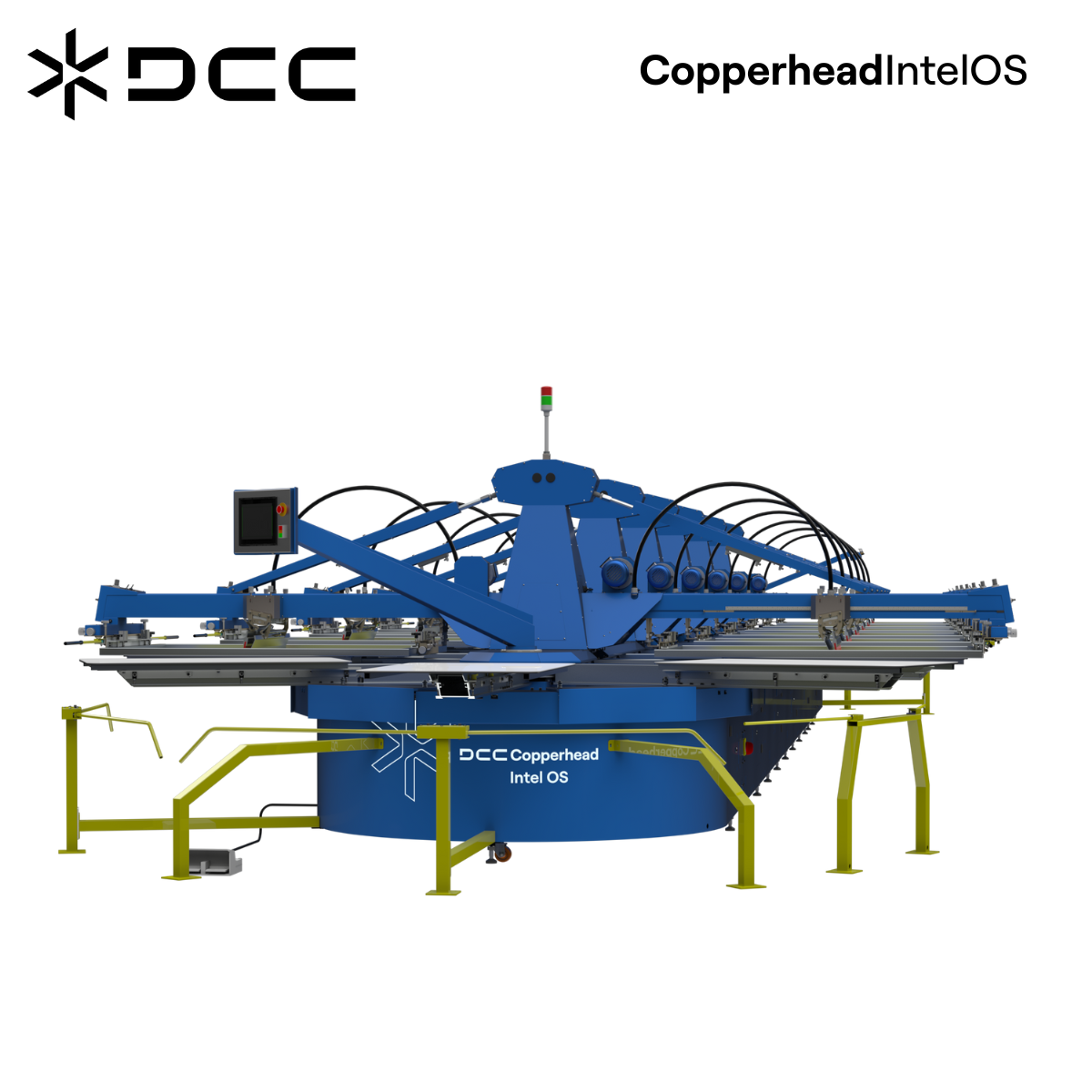 M&R Global DCC’s Copperhead Intel OS automatic oval screen printing press combines high volume throughput, and durable construction with the latest features in oval press design. The press comes standard with electronic printheads, pneumatic frame locks, independent controls for print & flood speeds, and the full suite of smart automatic programs that work in either clockwise or counter-clockwise printing configurations.